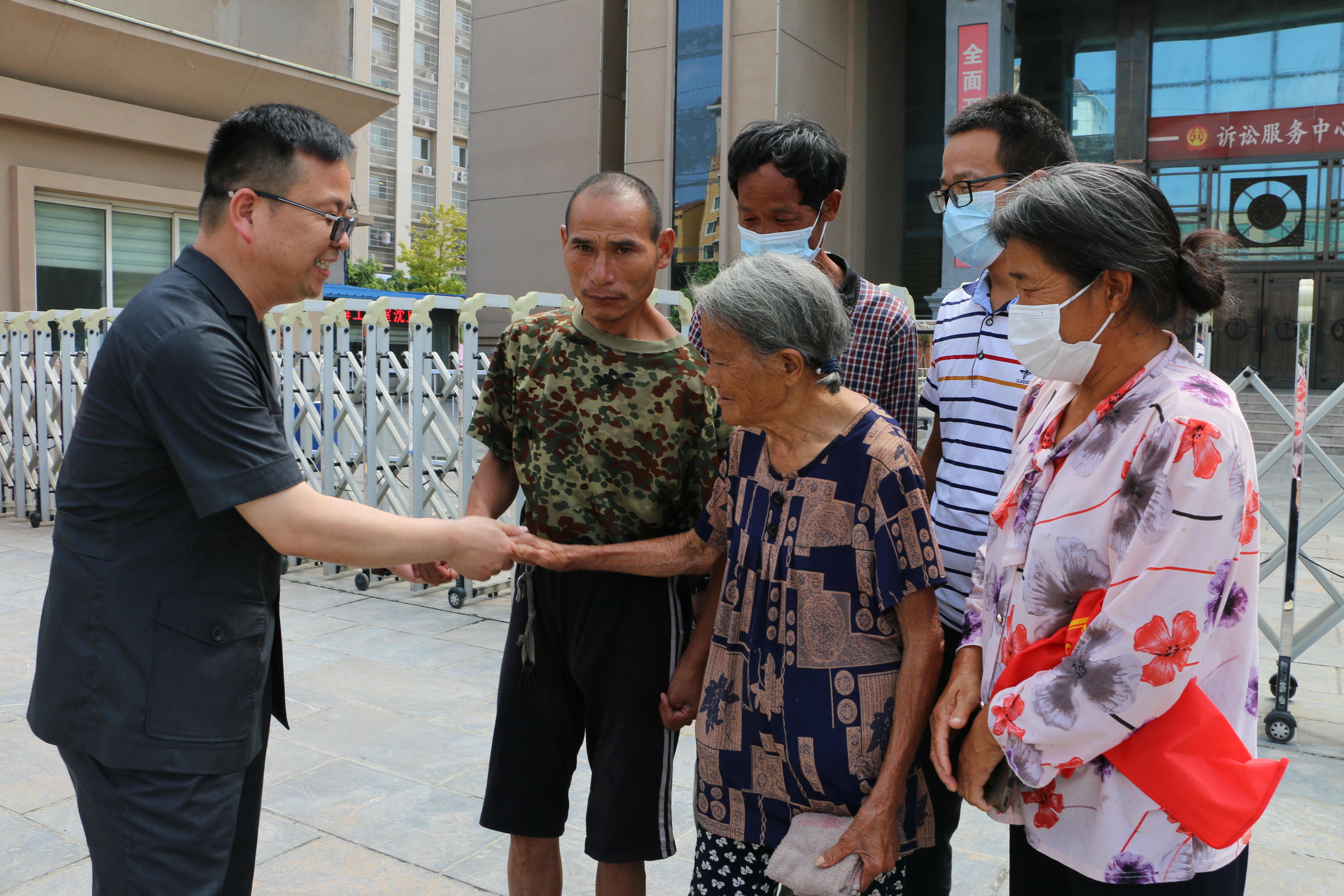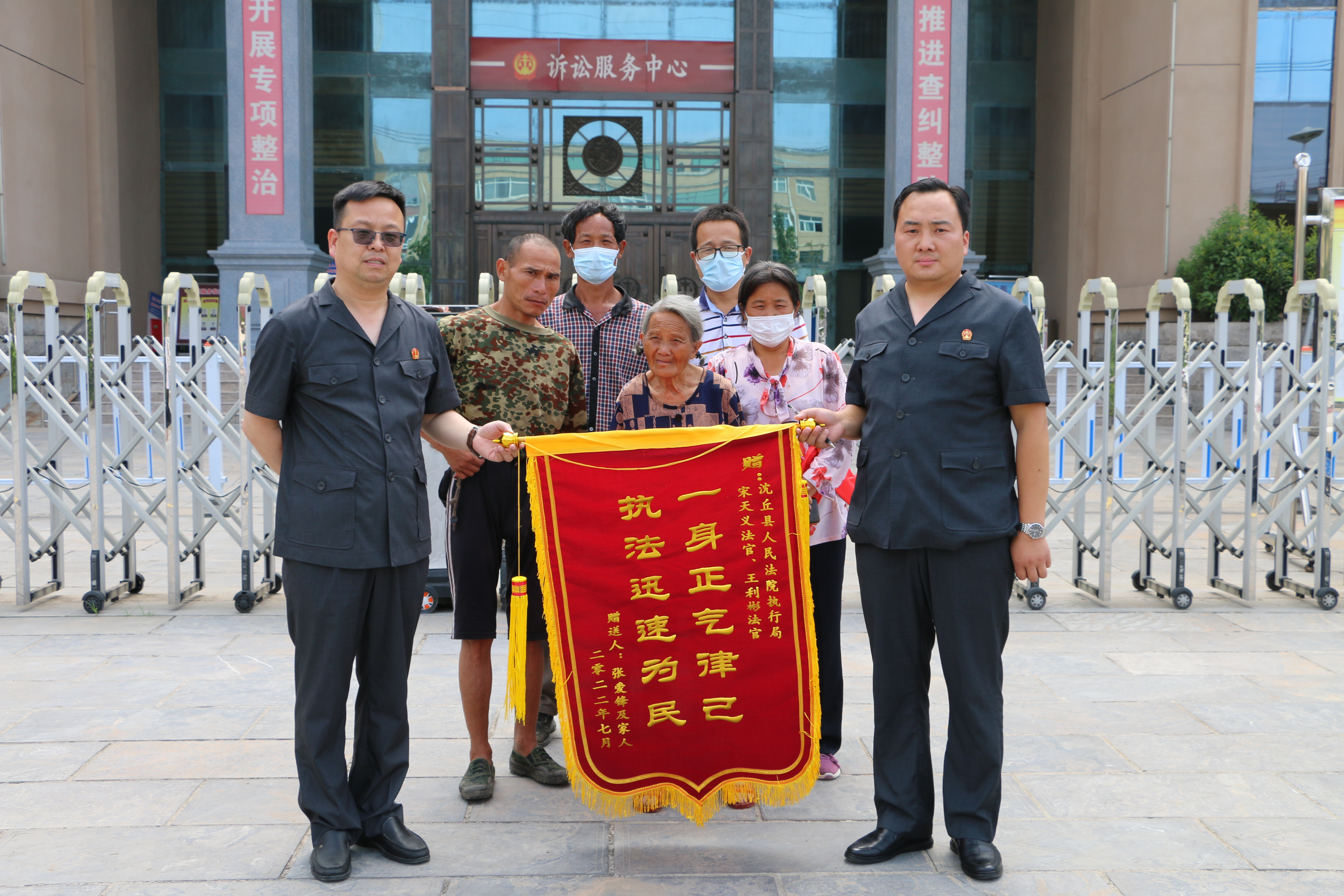 “非常感谢你们为了我们的案件这么尽心尽力,你们辛苦啦!”7月18上午,一起交通事故纠纷案件的申请执行人张李氏一家五口满怀感激之情,将一面绣着“一身正气律己,执法迅速为民”的锦旗送至执行法官宋天义团队手中,申请执行人握着宋法官的手久久不愿松开。