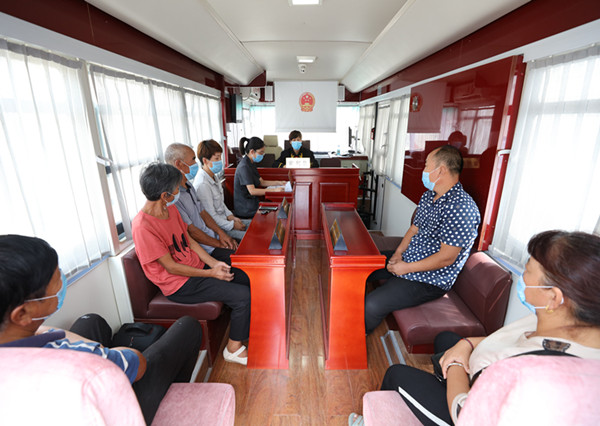 由于天气炎热,当事人容易烦躁发怒,不利于矛盾化解,法官刘美云等人决定启动自带审判桌椅、空调等设备的巡回审判车到案发地现场办案。