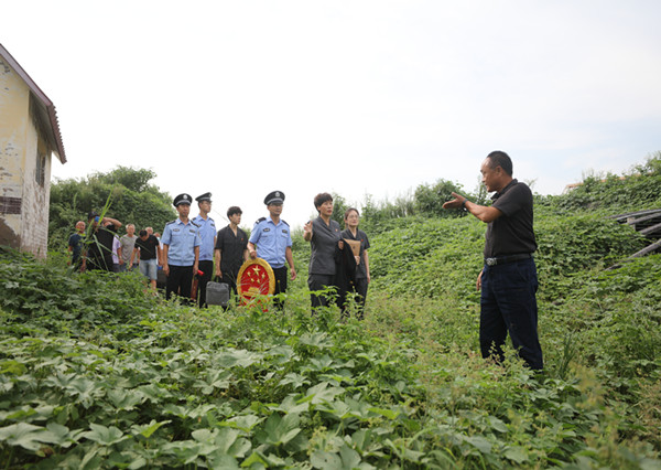 期间,干警们拨开杂草开路,跳入杂草比人还要高的撂荒的一米多深的大棚内查看了相关情况。